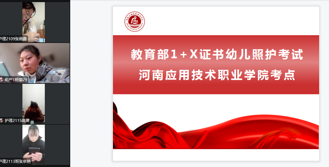 2022年12月18日,河南应用技术职业学院护理学院承接的教育部1+X证书幼儿照护考试在线上举行,本次有75名护理及助产专业在校学生参加。考试在各部门领导高度的重视下,监考老师的严格考评中,督导员的全程监察下圆满落下帷。