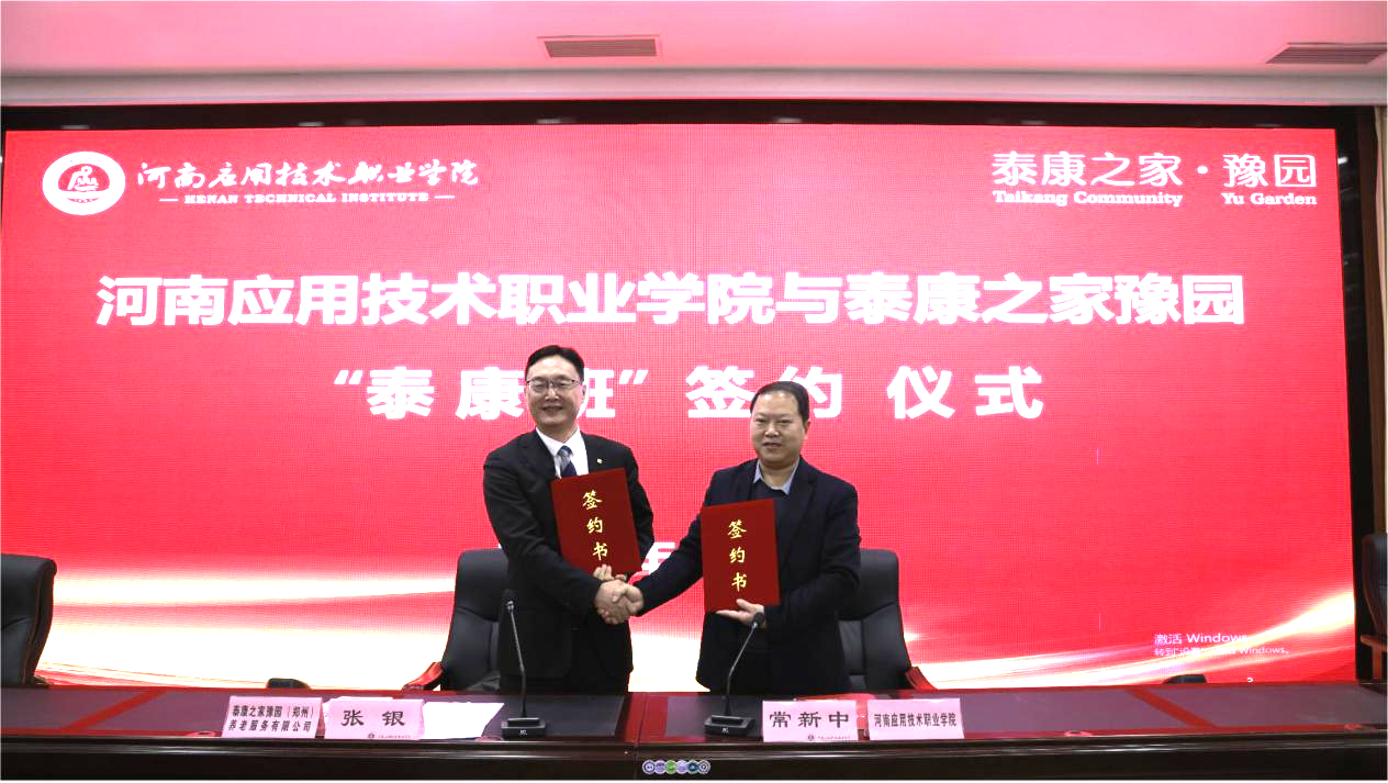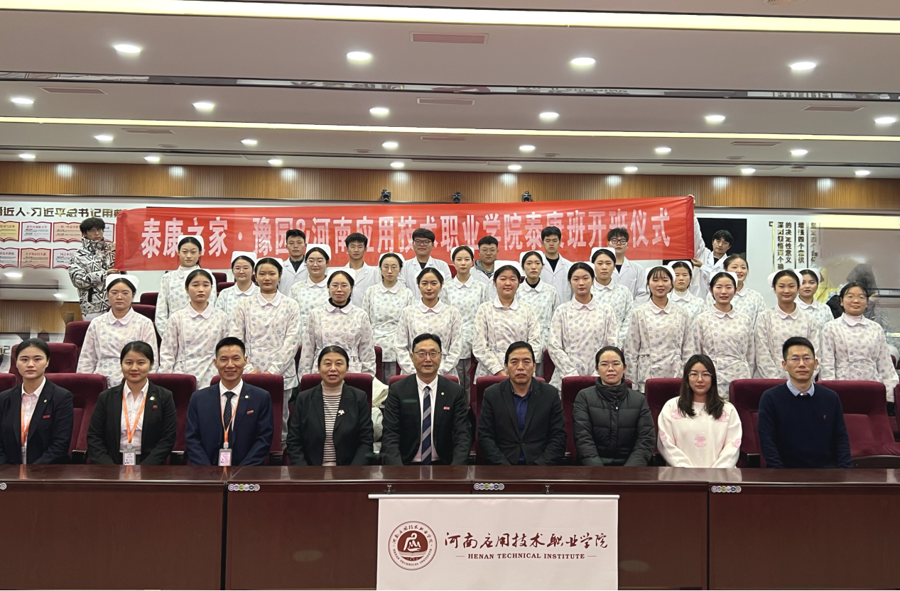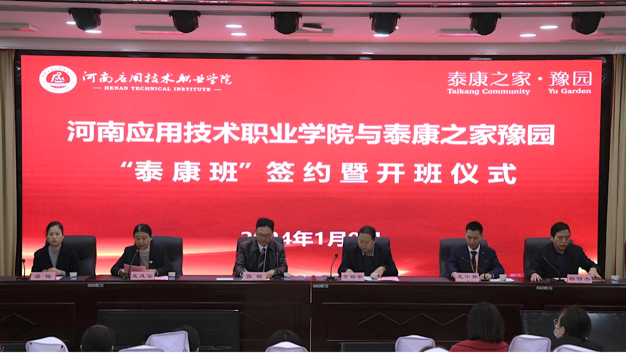 2024年1月9日,河南应用技术职业学院与泰康之家豫园养老服务有限公司签约仪式暨2024届泰康班开班仪式在郑州校区举行,学校副校长常新中、豫园社区总经理张银,人力资源总监王中升出席会议,会议由护理学院院长王风云主持,护理学院党政负责人及专业负责人、校企合作与就业处相关领导、师生代表近200余人在场共同见证。