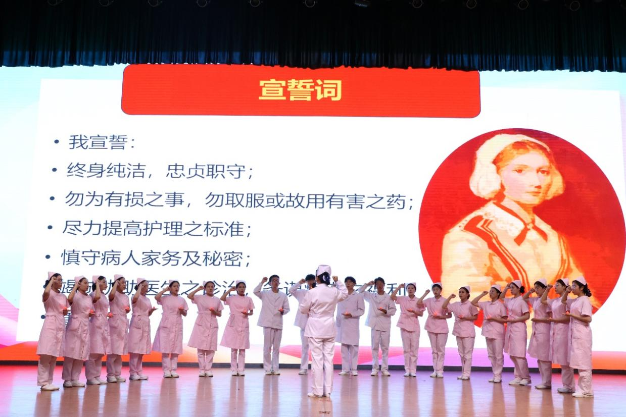 全场护理专业学生在护理学院院长王风云的带领下,举起右手庄严宣誓。“我宣誓:终身纯洁,忠贞职守。勿为有损之事,勿取服或故用有害之药。尽力提高护理之标准,慎守病人家务及秘密。竭诚协助医生之诊治,务谋病者之福利。谨誓!