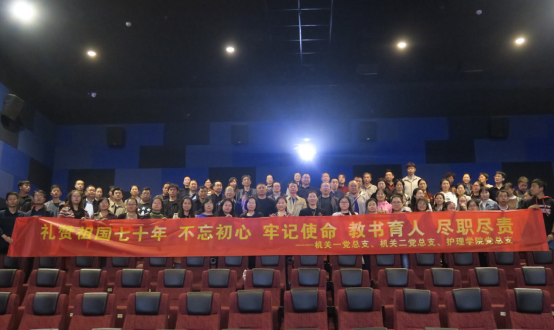 为庆祝中华人民共和国成立70周年华诞,深入贯彻落实党的十九大精神和习近平总书记在“不忘初心、牢记使命”主题教育工作会议上的重要讲话精神。10月10日晚,我校机关一党总支、机关二党总支和护理学院党总支结合“不忘初心、牢记使命”主题教育,组织全体党员100余人参加“我和我的祖国”集体观影活动。