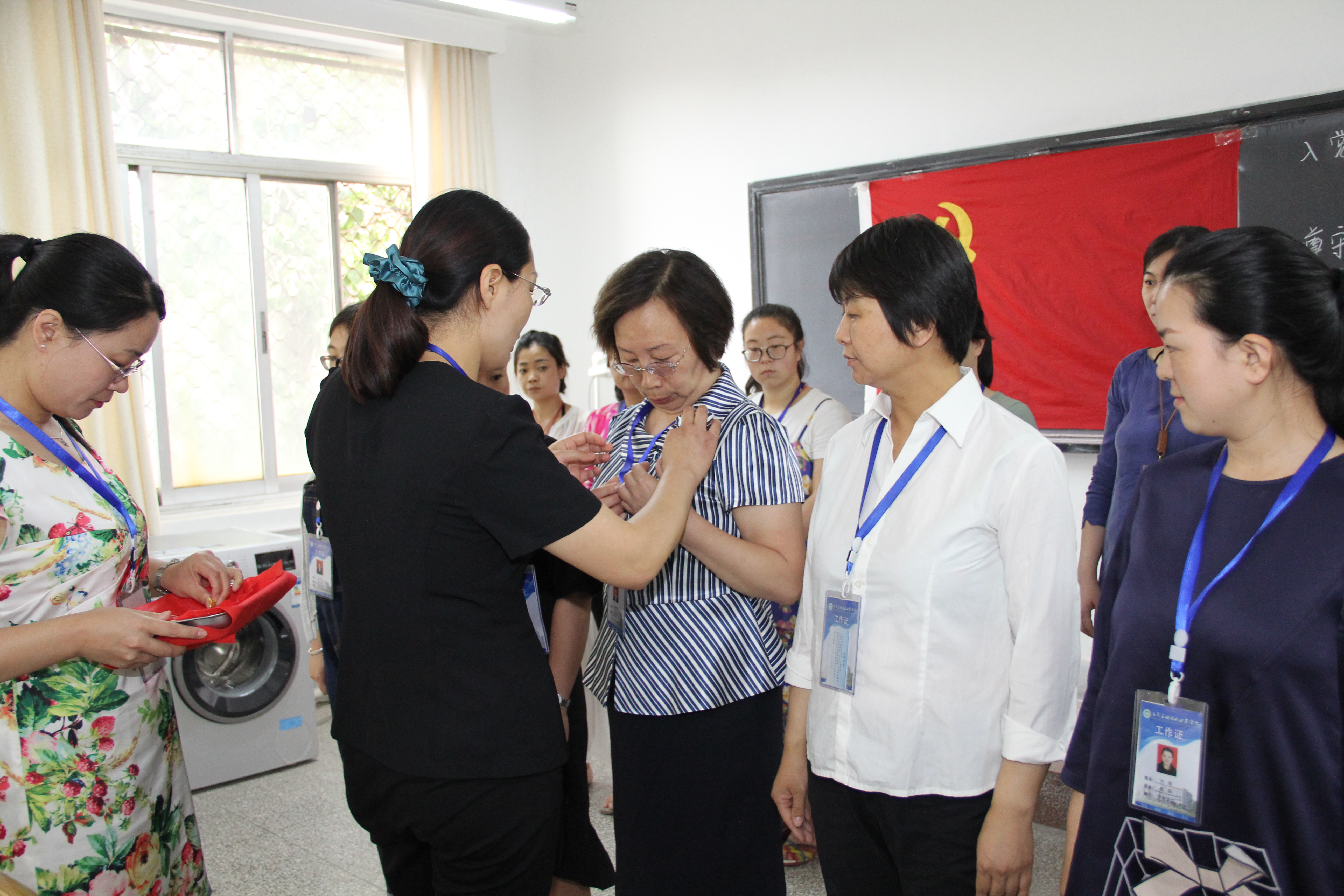 仪式上,徐娟书记为党员同志佩戴党员徽章,她指出,佩戴党员徽章是一种荣誉、责任和意识,徐娟书记希望大家能以实际行动亮化党员形象,并要求全体党员严格按照学校佩戴党徽的规定戴好党徽。