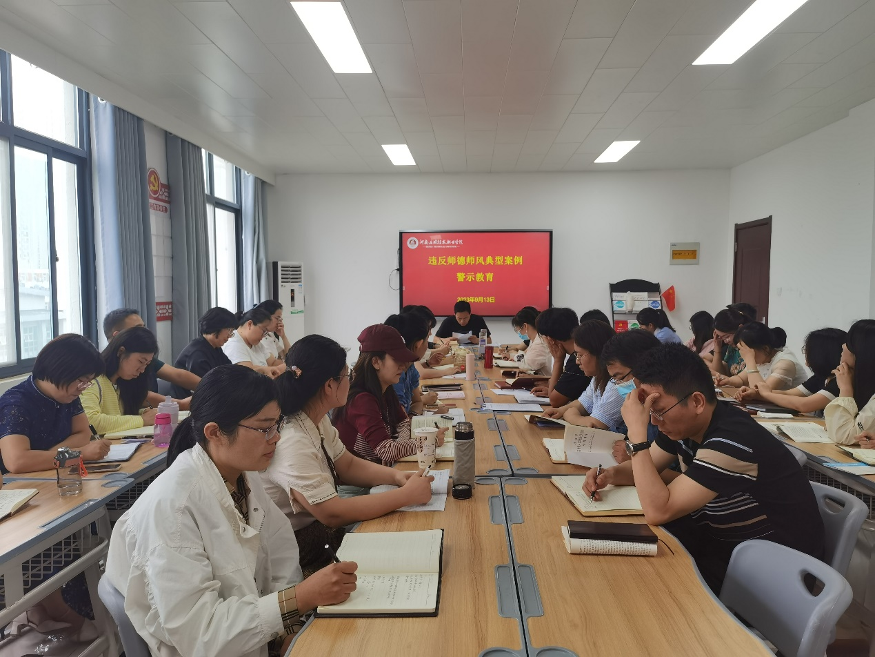 会上,杨明杰通报了五起违反师德师风的典型案例,并要求全体教师要以典型案例为反面教材,以案为鉴,以案示警。杨书记强调全体教师要时刻以“德高为范,身正为师”八个字提醒自己,做到以德立身、以德立学、以德施教、以德育德。