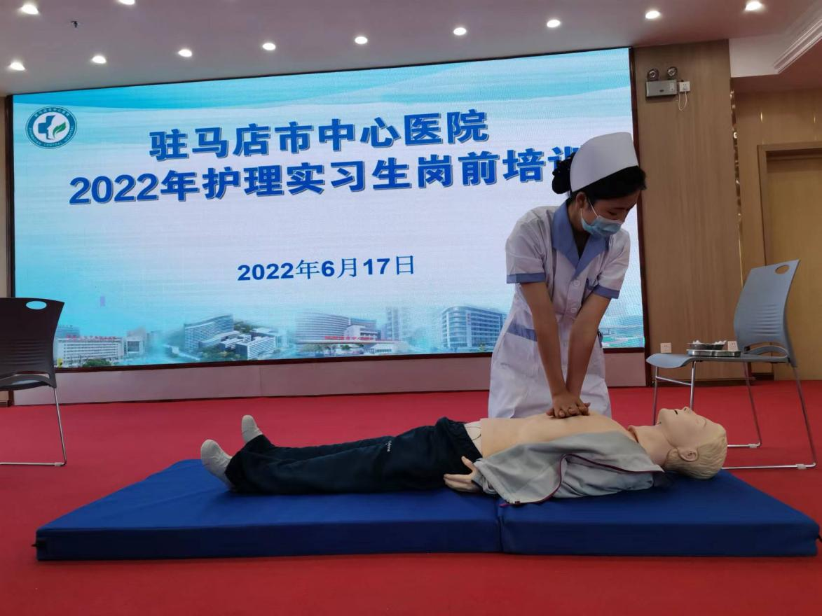 我校护理学院护理2016班冯新茹同学实习期间表现优异,在驻马店市中心医院2022年护理实习生岗前培训中,在教师示范操作心肺复苏术后,冯新茹同学积极举手参与现场演示,沉着冷静、娴熟干练的操作技术受到医院护理部主任及其他在场护士们的一致好评。在演示结束后,冯新茹同学与其他两名医院在职护士作为代表,参与当地电视台关于医院宣传视频的拍摄,演示心肺复苏急救技术。