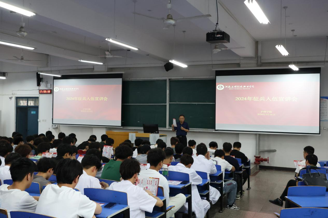 青春,是热血的代名词;报国,是青春的至高荣誉!2024年5月16日,护理学院在B101召开2024年征兵宣讲会。这次宣讲会旨在向广大学生普及国防知识,激发爱国情怀,引导学生积极参与国防建设,服务国家和人民。河南应用技术职业学院武装部胡平、宋春磊出席会议,护理学院2022级全体男生参会,宣讲会由护理学院党总支书记杨明杰主持。